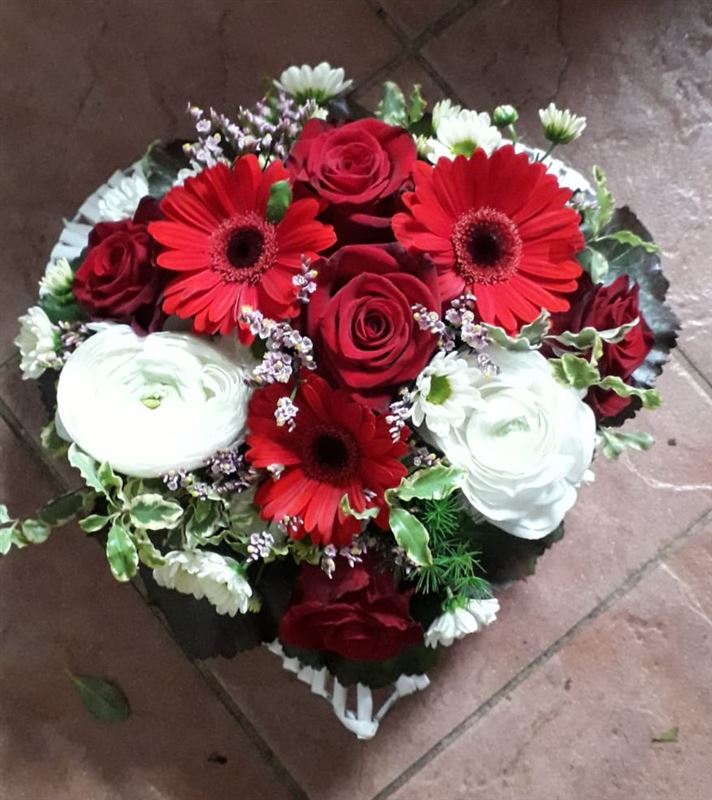 Cuore di ranuncoli bianchi, rose rosse e gerbere rosse